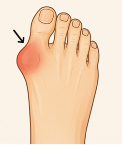 母趾の付け根の関節が内側に突出してしまうため、突出部が靴に当たることで痛みが生じることがあります。